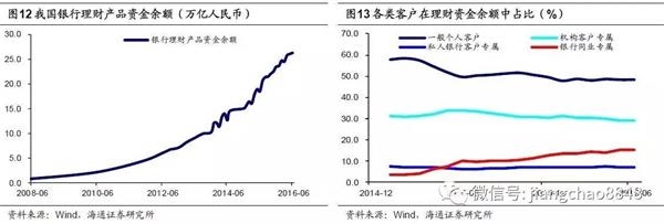 14年以来,理财表现出的一大新特点是同业理财急速飙升。与同业存单飙升的逻辑很类似,中小银行为了扩大规模,成为同业理财的发行主力。银行同业理财占总理财资金的比重在2015年初时不足4%,而截至2016年年中这一比例已经达到了15.3%,规模净增加了3.5万亿。