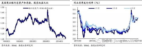 金融体系的风险在增加。如果扣除存款以后,增加的杠杆往往是金融泡沫的体现,因为如果银行体系的入了实体经济,最终又会以存款的形式回流到银行系统,而如果银行的资金只在金融体系中打转往往形成泡沫。美国在泡沫和08年金融危机爆发前,均经历了银行业杠杆率大幅上升的过程。业杠杆率的飙升,也孕育着较大的风险。从负债端来看,当前银行同业存单发行利率从去年低点时的不足3%,已经上行到了4.4%以上,资金成本在上升。而从资产端来看,债市震荡,经济下行压力增加贷款和非标风险,资产和负债息差收窄将对银行、尤其是中小银行盈利构成巨大的威胁。