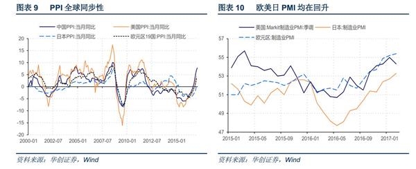 PPI主要是可贸易品,具有明显的全球同步性,,即使是饱受通缩困扰的日本,PPI的走势也和美、欧、日基本一致。2008年金融危机过后,全球工业生产都陷入供需失衡的格局,工业价格持续低迷,中国在2009年和2012年两轮强刺激的扰动下最为严重,即使是2013-2014年的全球反弹中也而没能浮出水面。本轮PPI的快速反弹,中国也非孤例,原油为代表的大宗价格反弹和2016四季度以来美日欧持续回升,对全球PPI形成比较强的支撑。