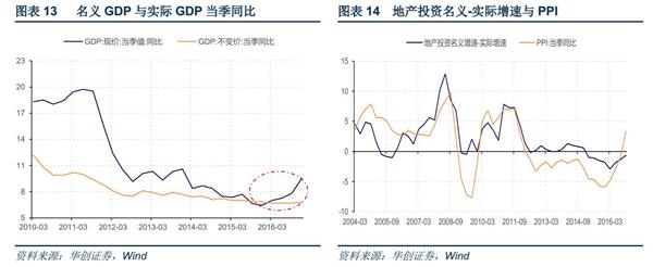 价格“幻象”营造需求持续改善的幻觉。价格推升下,经济L型,名义却呈V型,投资等名义数据同样会异常靓丽。以地产投资为例,2016年地产投资实际增速为7.6%,假设2017年回落至2015年的2.8%,由于2017年地产投资价格指数将上涨2%以上,对应名义投资增速将高达5%左右。考虑到2016年土地出让金增速高达19.3%,地产新开工增速也有8%,土地购置费的延后支付和现有施工项目原本就对2017年的地产投资有一定的支撑,2.8%的实际增速应是保守的估计,相应的名义增速较2016年下滑的空间非常有限。