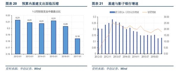 基建的春季躁动能否延续,制约因素来自影子体系是否还会进一步膨胀。1-2月财政支出中基建相关部分(交通运输、农林水、城乡社区事务)占比不及2012年至2015年同期水平,随着地方财政腾挪空间越发逼仄,预算内基建支出正在被压缩,当前基建的躁动主要依赖PPP来破局。由于PPP对民间资本的吸引力有限,最终预算外资金仍旧主要来自金融体系,金融去杠杆下,影子银行扩张受限,基建的资金约束也将逐渐突显。