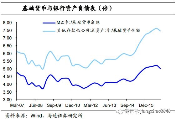 从实体经济的信用扩张来看,以“M2/基础货币”表示实体层面的货币乘数,那么14年底,该比例在4.2左右,15年该货币乘数上升至5左右,16年12月末则达到5.02.