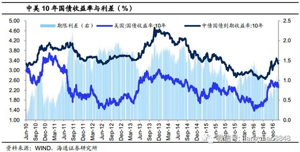 自从14年央行启动降息周期以来,中美国债的利差持续收窄,加深了的压力。17年13月,美国启动本轮第三次加息,17年美联储加息节奏预期加快,这意味着为了稳定预期,国内利率也有上调压力。