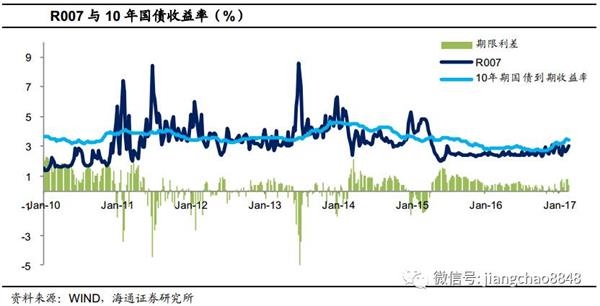 我们预计17年上半年R007中枢在2.5%-3%左右,期限利差若为过去2年均值40-50bp,那么对应10年国债利率区间在3.1%-3.5%左右。