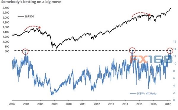 Goepfert说道:“从历史上来说,当偏斜指数与VIX的关系处于极端水平时,未来1至2个月内标普500指数的走势相反。”