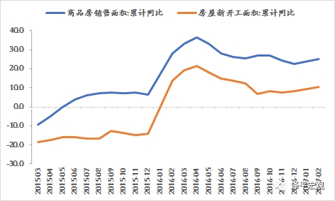 1、房地产销售仍然维持较高增速。销售一般领先投资半年左右。2014年“930”救市以来,尤其2015年下半年以来,房地产销售十分火爆,其中2016年全年房地产销售面积、金额分别增长高达22.5%、34.8%。即使2016年国庆房地产调控之后,由于一二线热点城市向三四线城市的溢出效应,2017年初大都市圈周边的三四线城市销售火爆,1-2月房地产销售面积、金额分别增长高达25.1%、26%,而且这还是在2016年1-2月28.2%、43.6%的高基数下实现的。考虑到销售一般领先投资半年左右,预计房地产投资在未来相当一段时间内还在回升的通道中。