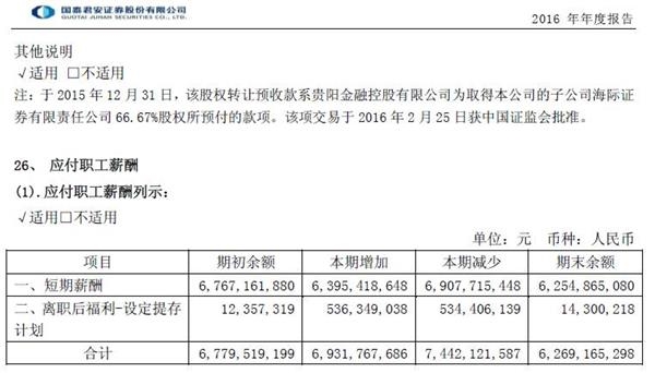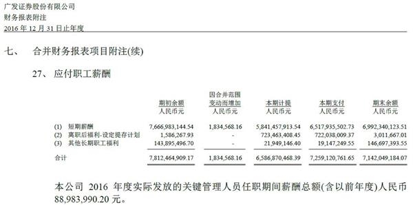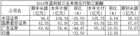 截至2016年末,中信证券、国泰君安证券和广发证券应付职工薪酬余额分别为94.6亿元、62.55亿元、69.92亿元,而截至2015年底的这3个数据分别是96.03亿元、67.67亿元、76.67亿元。