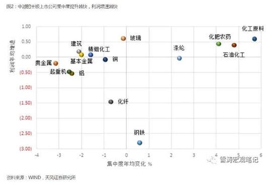 随着市场化出清和行政化去产能,在淘汰出清中存活下来的大企业逐渐形成剩者为王的竞争格局,利润复苏较快。我们分析了中游行业的主板上市公司后发现,集中度提升越快的行业,利润复苏的越快;集中度已经接近或处于寡头竞争的中游行业,平均利润率越高。