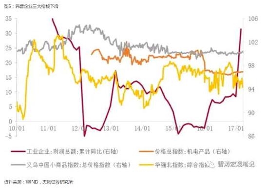 如果说新三板上市企业不能代表中小企业,那么代表中小民企经营状况的三大指数(义乌小商品指数,五金机电指数,华强北指数)就更是和工业企业利润增速没有相关性。代表规模以上的工业企业利润从16年2季度开始复苏,但是义乌小商品指数从2011年景气的顶点之后就一路下滑至今,五金机电指数在2016年发生断崖式下跌,华强北指数从2011年起就处于100以下,2015年初至今仍然在震荡下行。