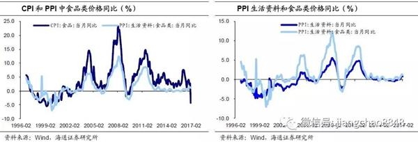 所以从走势上来看,CPI中的食品价格同比和PPI生活资料中的食品类出厂价同比走势是一致的。但不同的是,CPI中的食品价格波动要明显比PPI食品价格波动更剧烈,这也说明了价格从上游向下游的传导是打折扣的,主要还是决定于上下游的议价能力。