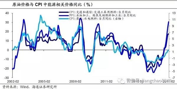 第四,PPI中生产资料价格也会直接向CPI传导,油价是最典型也是最显著的例子。能源类价格在CPI中主要体现在两个项目中,一个是交通通信下的交通工具用燃料,另一个是居住下的水电燃料。从价格走势来看,PPI中油价走势和CPI中能源类价格走势高度相关,且基本没有时滞。而燃料价格的提高也会间接影响其它产品的运输成本,对通胀有进一步的推升作用。
