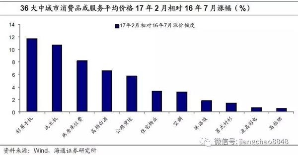近半年尤其是17年以来,下游终端的消费品和服务价格出现了不同程度的上涨。根据发改委统计的36个大中城市消费品和服务价格,相比半年之前,手机和家电明显涨价,例如手机平均价格半年上涨了11.8%,洗衣机上涨了10.7%,此外,病房床位费、高档白酒和公路货运半年来均价涨幅也都在5%以上,相比之下,服装如男士衬衫均价仅涨1.4%,而高档烟涨价则只有0.6%。综合而言,涨价较多的终端消费主要集中在:手机、家电、服务、高档白酒等,而衣着、香烟类价格较为稳定。