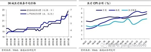 第三,制度因素亦有贡献,主要推动了医疗服务类的涨价。近几年国家推进医疗改革的进度加快,对药品生产企业提出了更高的生产、环保要求,提高了药品生产成本,所以中西药都在涨价。此外,16年7月四部委印发《推进医疗服务价格改革的意见》,取消药品加成,并提高了诊疗、手术、康复、护理等医疗服务的价格,因而近半年医疗保健价格明显上涨,并且未来医疗服务价格或仍将继续走高。