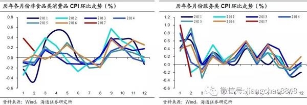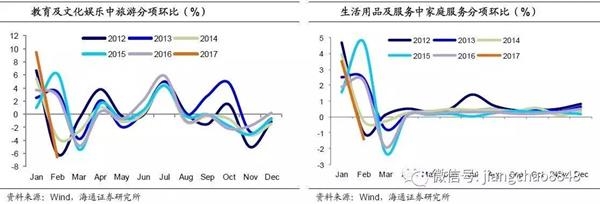 第二,1-2月涨价也有季节性因素的作用。在CPI的构成指标中,教育和文化娱乐分项包括教育和旅游,季节性波动特征强。教育价格一般在秋季和春季开学月份环比增加,而其余时间稳定。旅游则一般在春节、暑假和国庆等假期环比涨价。今年1月旅游分项环比9.5%,是近年的最大增幅,而16年底的环比降幅也是近年最小的。生活用品及服务中的家庭服务分项同样呈现季节性波动。春节前后用工紧张、人力成本高,家庭服务价格环比增长3-5%,而节后价格则明显回落。