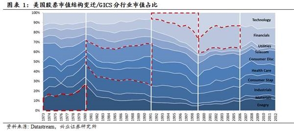 每一个时代有都有其一时之选,根据我们之前研究美国的经验,美国股市基本上以10年为一个大周期,70年代美国经济的是滞胀,从的角度,能源是滞胀期最好的投资品。80年代,沃尔克上台,采用货币主义实验治理通胀成功,进入稳定环境,能源板块的权重明显下降,进入黄金十年。90年代是美国的革命时代,科技部门的市值占比,从7%飙升到27%,直到科网泡沫破灭。2000年科网泡沫破灭之后,美联储的宽松货币政策引发了的投机热潮,金融部门的市值权重明显提升,但在2008年末的次贷泡沫破灭之后,金融部门的权重也大幅度下降。近几年,美国股市结构进行了一个缓和的平衡时期,看不到明显的泡沫和洼地。