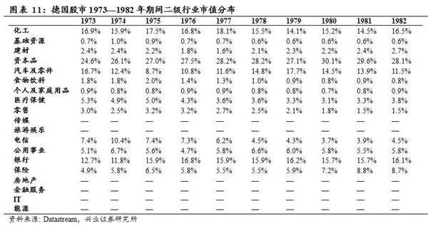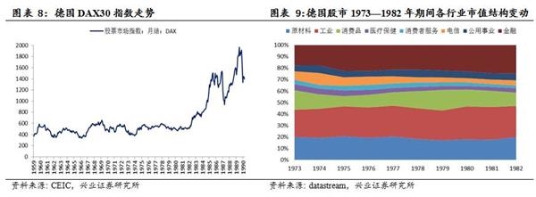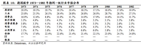 从股票市场上来看,DAX30指数在1973—1982年期间长期横盘,市值结构保持稳定,工业市值占比仍在提升,金融行业有较明显提高,而受经济危机冲击,消费品、医疗保健、消费者服务行业市值占比出现了一定程度的下降。