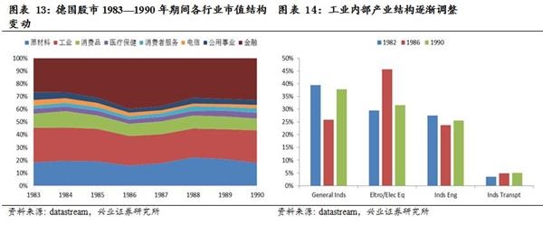 改革成效和经济复苏同样在资本市场上得到体现,DAX30指数1983年底为552.77点,至1990年底以上涨至1398.23点,市值扩张342.56%,消费类中的医疗保健和消费者服务行业市值占比有所增加,工业市值占比有所下降,其中,工业运输和电器行业扩张速度较快,传统工业和工程机械行业在工业整体中的占比则有所下降,产业结构调整已然发生并持续加速。
