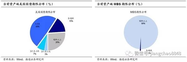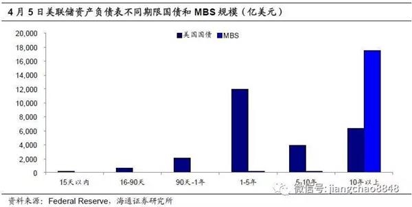 量化宽松政策和扭曲操作直接影响了美联储资产端的期限结构。由于MBS的基础资产为抵押贷款,美联储持有的MBS的到期期限主要分布在10年以上,没有5年期以下的产品。而扭曲操作也使得美联储资产端中的短期国债迅速下降,目前美联储持有的1年期以下美国国债占总资产的比重仅为10%左右。综合来看,目前美联储的资产端久期较长,未来缩表过程中,资产的出售对长端利率的影响远大于短端利率。