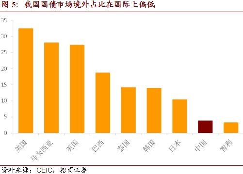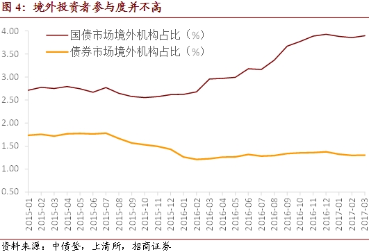 第一,政策上我国债券市场开放程度较低,且境外机构担忧我国债券市场对外开放政策可能生变;