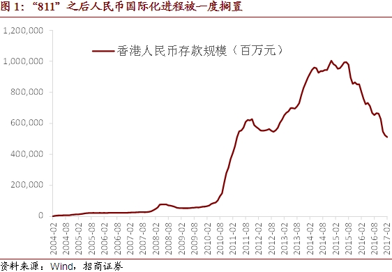 2015年“811”汇改之后,人民币汇率出现较大幅度的贬值,汇改至2016年年底人民币累计贬值幅度达到10.65%,在人民币汇率承受较大贬值压力的情况下,人民币国际化进程一度被搁置,香港人民币存款规模也自“811”之后快速下降。