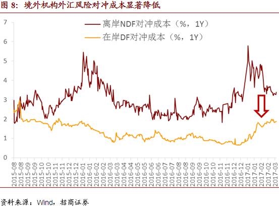 再次,包括离岸国债期货上市、开放在岸外汇衍生品市场在内的各项措施,使得风险管理工具不断丰富。早前港交所五年期中国财政部国债期货正式上市,可视为“债券通”正式开通之前的配套措施,将满足境外投资者管理人民币风险的需求,这也是首只在离岸市场交易的内地国债期货。此前也已对有关境外机构开放了在岸外汇衍生品市场,方便境外机构进行外汇风险对冲,相应的外汇风险对冲成本将显著降低(详见我们的前期报告《不积跬步无以至千里—评外管局对境外机构开放在岸外汇衍生品市场的新政》).