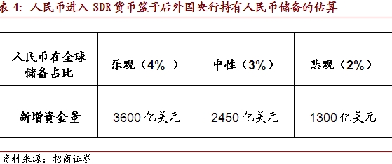 从货币篮子的角度测算。人民币纳入SDR将在中期刺激外国央行和国际组织将人民币纳入其资产,增加对人民币债券的配置需求。根据国际组织最新披露的数据看,日元和英镑在全球中的比重分别是4.5%和4.7%,综合考虑人民币在SDR货币篮子中的权重等因素,我们预计未来5年,乐观估计人民币在全球储备资产中的占比可以达到4%,中性的预测达到3%,较为悲观的预测仅为2%。据此估算,未来外国央行持有的人民币资产最多将达到4600亿美元,较之目前1000亿美元左右的人民币储备资产存量,将为我国带来3600亿美元的资本流入,年均达到720亿美元。而事实上,该估算规模仍低估了境外机构对人民币债券的购买力,因为我们仅仅考虑了境外央行调整其外汇储备资产的币种结构,并未包含其他类型的境外机构对人民币债券的配置需求。