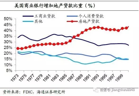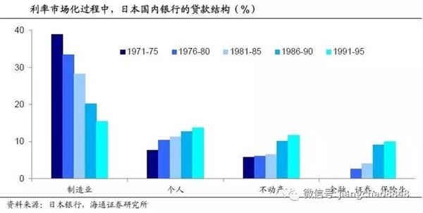 按揭贷款和地产贷款比重持续增加。日本商业银行在利率市场化过程中风险偏好显著提高。银行对地产行业的贷款占比从70年代前半期的6%持续增加值90年代前半期12%,同期对个人贷款(按揭贷款为主)的占比同样持续增加,从8%增至14%。另外,金融、证券和保险业的贷款比重同样增加,其中一部分的贷款又投向房地产市场。而制造业贷款比重持续大幅下滑,71-75年均值为39%,到了91-95年这一均值仅为15%。