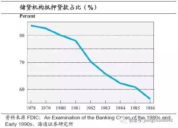监管放松,风险偏好抬升。80年代初,针对储贷机构的相应管制逐渐放开,如允许提供浮动利率的抵押贷款、降低资本充足率要求、放开投资限制等。储贷协会开始快速扩张,FDIC数据显示,储贷机构总资产从1983年的6860亿美元增加到1985年的1.07万亿美元,大幅增加56%,远高于同时期商业银行和储蓄银行24%的资产增速。另外,储贷机构不仅增加房地产抵押贷款规模,还将大笔资金投向了商业地产、权益类资产、垃圾债券、各类项目投资贷款等高收益资产,带动抵押贷款资产占比从1981年的78%降至1986年的56%。