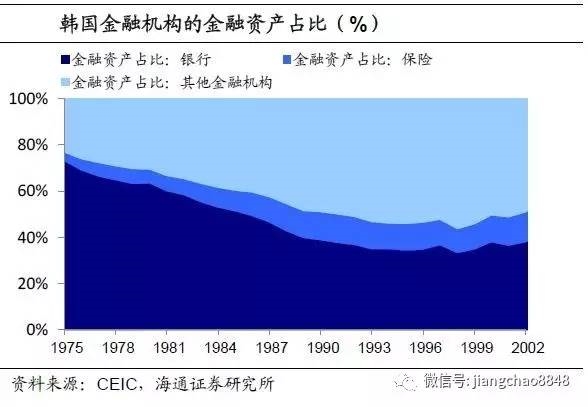 韩国利率市场化等金融自由化改革,带来了金融业资产的快速增长,其中非银机构增长尤其迅猛。1980至1996年,银行业金融资产平均增速为20%,其他金融机构的金融资产平均增速高达28%。从金融机构的金融资产结构来看,非银机构金融资产占比从1980年的36%大幅增加至96年的65%,对应商业银行金融资产占比持续下滑。
