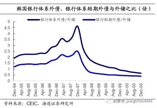 97金融危机爆发,外债大量减少。97年东南亚金融危机波及韩国,金融体系的短期外债恐慌性流出,外储减少,韩币大幅贬值。其中97年11-12月,韩元两个月贬值了46%。银行体系外债则由97年3季度的646亿美元大降至4季度的492亿美元。
