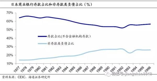 存款占比下滑,主动负债增加。与美国一样,利率市场化过程中,日本商业银行的负债结构同样发生变化,存款占总负债的比重从1977年的64%降至1996年的57%,对应主动负债占比从77年的14%上升到1996年的26%。从增速来看,1997年至1996年,日本商业银行存款增长200%,而同期金融机构存款增长近9倍,存单增长10倍,活期借款(Call Money)增长14倍。
