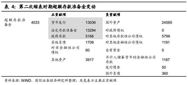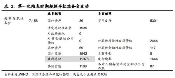 同时,考察过去两轮缩表时期超额准备金的实际表现,缩表也的确没有导致超额准备金的同步减少。根据我们的估算,第一次和第二次缩表期间超额准备金均是增加,增量分别为7158亿和4033亿。具体来看,第一次缩表时期,由于财政存款投放,因此各级政府在央行的政府存款大量减少,金融机构超额准备金增加。而第二个时期的超额准备金增加,则对应着法定存款准备金减少、货币发行减少以及政府存款减少。