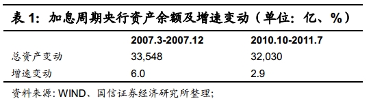 2007年3月-12月和2010年10月-2011年7月是我国历史上两轮典型的货币紧缩周期。而在这两段时期内,我们均没有观察到我国央行资产负债表的收缩,不管是以绝对量还是以同比增速来衡量。而且让人更意外的是,这两轮加息周期反而对应着央行资产负债表的快速扩张。