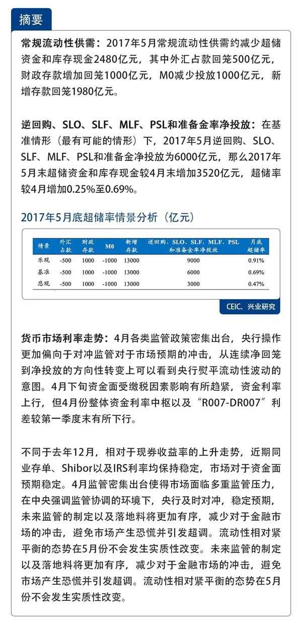 悲观情景,2017年5月逆回购、SLO、SLF、MLF、PSL和准备金净投放为3000亿元,那么2017年5月末超储资金和库存现金较4月末增加520亿元,超储率较4月增加0.03%至0.47%。