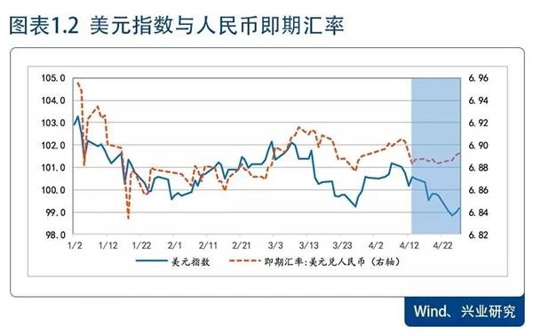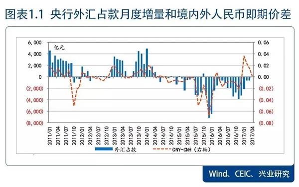 第一,预计2017年5月央行外汇占款下降500亿元。央行外汇占款变动金额与在岸离岸价差呈现明显的正相关(图表1.1)。央行公布的最新数据显示,2017年3月外汇占款继续减少547亿元,降幅较前期小幅收窄。截至2017年4月30日,2017年4月人民币汇率CNY-CNH价差的月度均值为0.0027,相较于2016年3月(0.0151),价差有所收窄,但依旧为正。价差收窄与外围市场情绪有关,4月首轮投票初步统计显示中间路线的独立候选人马克龙和极右翼候选人勒庞晋级第二轮,市场风险偏好明显回升,美元指数应声下跌。人民币并未受很大影响,即期汇率仍窄幅震荡(图表1.2)。整体来看,外围因素对于国内流动性的制约并不强,预计2017年5月央行外汇占款小幅减少500亿元。