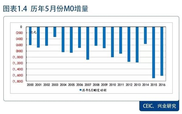 第三,预计2017年5月M0减少1000亿元。历史数据显示,以往5月M0有明显的季节性,大部分情况下为M0的减少。2014-2016年,5月M0分别变动-564亿元、-1696亿元和-1622亿元。预计5月M0减少1000亿元左右。