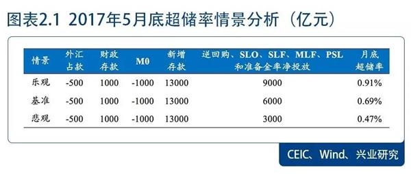 乐观情景,2017年5月逆回购、SLO、SLF、MLF、PSL和准备金净投放为9000亿元,那么2017年5月末超储资金和库存现金较4月末增加6520亿元,超储率较4月增加0.47%至0.91%。