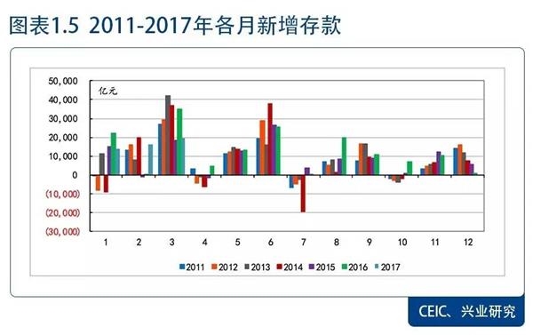 第四,预计2017年5月存款(剔除非金融机构存款,下同)余额增加13000亿元左右。历史数据显示,历年5月存款的变动季节性很强,都表现为存款的增加。2014-2016年期间,5月存款余额分别变动13700亿元、12900亿元和13282亿元。预计5月份存款余额会增加13000亿元左右;同时考虑到财政存款增加1000亿元左右,约增加缴备金1980亿元。