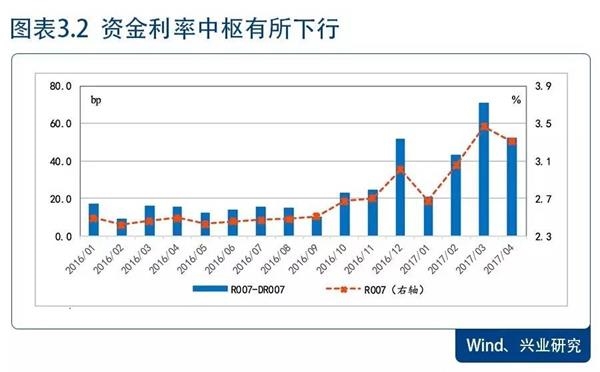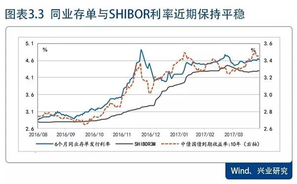 市场对于流动性预期保持稳定。近期债券收益率突破了去年12月债市大跌时期的高位,但是债市这两轮走弱对于流动性的影响与预期却有明显的不同。首先,图表3.3的数据显示,不同于去年年底,随着10年期收益率的上行,同业存单与Shibor利率并没有跟随出现明显的上行。一般而言,同业存单利率中会反映机构对于未来流动性的预期溢价,当下同业存单利率整体稳定在高位。除此之外,Shibor 3M利率走势具有较强的粘性,即易上难下。自2016年8月来,Shibor 3M一路攀升,直到今年第一季度末后才开始有所下行并在当下保持稳定。这表明机构对于未来负债成本大幅上行的预期并不强烈,但也难以看到利率明显的下行预期。其次,在去年12月债市下跌之时,IRS利率快速上行,甚至超过了5年期国开债收益率,利差一度由正转负(图表3.4)。但是本轮现券收益率上行之时,基于FR007报价的5年期IRS利率保持平稳,也表现出了市场对于未来流动性平稳的预期。这是央行通过货币政策对冲监管政策之时,市场对于未来流动性price in的结果之一。