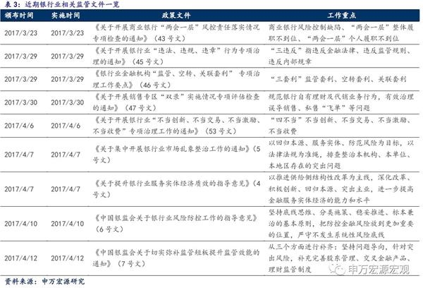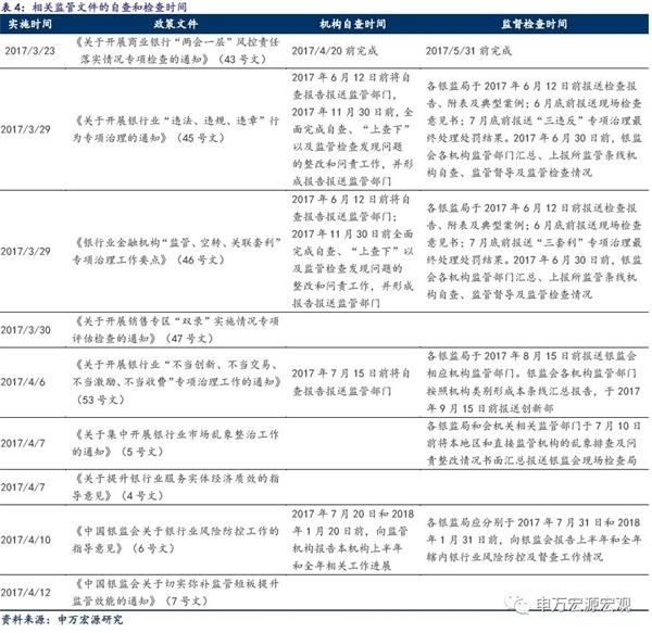 以银监会为例, 近期银监会出台了多份监管文件,重点对同业和委外进行检查。明确同业存单应计入同业负债,规模不得超过总负债的1/3,理财不得进行多层嵌套等,这些规定的落实直接限制了和金融机构加杠杆的空间,也将改变过去金融结构无序扩张和无序加杠杆的情况。从要求的自查和检查的时间来看,多数时间要求比较紧迫。从监管自身的节奏来看,二季度主要是完成机构的自查和检查情况,三季度可能会在自查和检查的基础上,提出一些具体的整改意见。