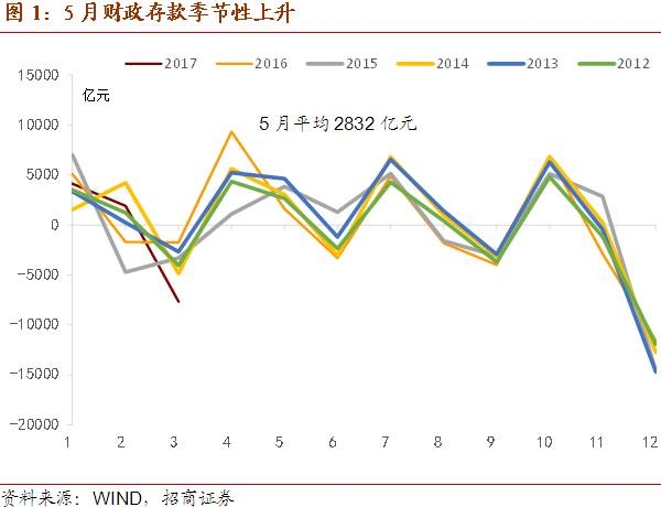 5月仍面临税收上缴的压力,对资金面仍有冲击。根据历史数据,5月份财政存款变动均表现为增加,具有较强的季节性。2014-2016年,5月新增财政存款数额分别为3027亿元,3853亿元和1619亿元。其中2016年5月新增财政存款较低的主要原因是当年4月财政存款大幅新增9318亿元,远超历年同期平均值,这个节奏变化的背景是地方债集中发行和营改增。今年地方债发行节奏显著放缓,不会对财政上缴的节奏产生干扰。