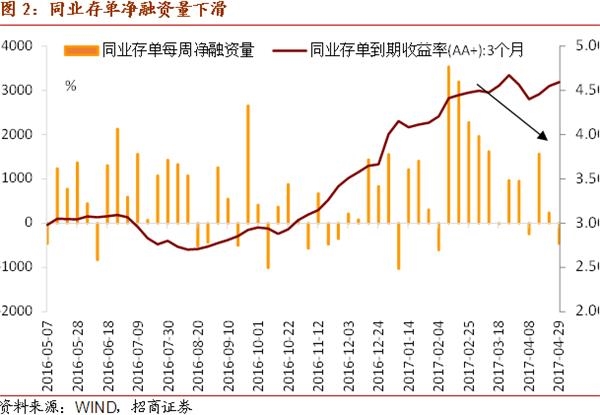 央行2016年初正式推出宏观审慎管理体系MPA,并在2017年初进一步完善,把表外理财业务纳入监管,商业银行的资产负债表增速逐渐放缓,债券市场的杠杆率也出现回落,不过2016年末债灾的导火索——同业存单仍在高位,一季度月度发行量快速上升,导致同业“去杠杆”始终差强人意。