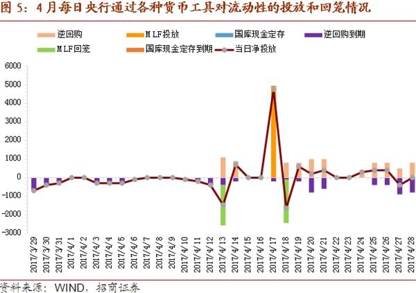 央行在4月总计净投放资金2540亿,主要集中于后半月的逆回购操作。在17日续作了4955亿MLF,对分别于13和18日到期的共4515亿MLF进行超量对冲。此外,还投放839亿元抵押补充贷款,PSL主要是针对政策性银行而非商业银行,主要功能是定向对社会发展提供资金支持,刺激基础设施建设,对银行间流动性影响较小。