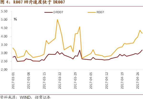 4月对委外遭遇大额赎回的担忧不断冲击资金面,推高。从银监会监管政策来看,直接针对委外的政策并无收紧,不过委外的资金来自于表内自营资金和表外理财资金,这两者皆会受到政策从严落实执行的影响。银监会层面首次正式在文件中提及禁止同业投资多层嵌套,做实穿透管理,并控制同业存单的发行规模。同时,强调不允许同业资金购买自己以及其他银行的同业存单,并进行委外,防止出现资金空转。