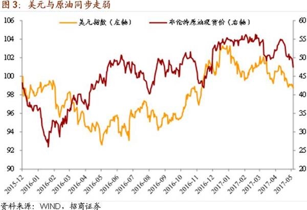 4月上旬,美国对叙利亚发动直接军事打击,加之朝鲜半岛、法国大选等政治事件的冲击,避险需求使得美元指数与原油价格形成了一个价格高峰。此后,随着上述事件的逐步缓解,市场避险情绪也逐步降温,使得美元指数与原油价格同时回调。