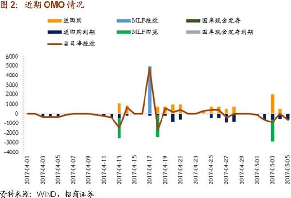 5月第一周资金面依然偏紧,市场担忧任何可能引发流动性紧张的监管政策变化。每日开盘时资金面最紧,然后逐渐缓和。这反映出市场高度依赖于大行的融出,而大行也要看央行的公开市场操作和调节流动性的货币工具投放情况,市场对流动性预期偏紧。DR007和R007均较4月末回落,两者之差收窄,机构间资金多寡不均衡的局面有所好转。不同与4月末公开市场超量投放,5月第一周央行缩量对冲,维持资金面紧平衡的局面。5月第一周净回笼2200亿元。5月后面三周的到期量仍大,分别是3100亿元、包含MLF在内到期2795亿元与800亿元。