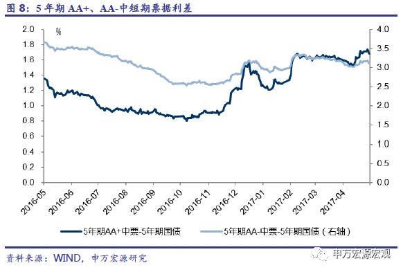 票据收益率全线上升。1年期、3年期、5年期AAA票据收益率分别上升6.9、13.0、11.8个基点,至4.46%、4.75%、4.83%;1年期、3年期、5年期AA+票据收益率分别上升5.8、12.0、10.8个基点,至4.79%、5.08%、5.16%。信用利差下降。1年期、3年期、5年期AAA票据信用利差分别下降15.7、7.0、2.2个基点,至1.07%、1.32%、1.35%;1年期、3年期、5年期AA+票据信用利差分别下降16.7、8.0、3.2个基点,至1.40%、1.65%、1.68%。