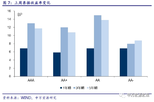 票据收益率全线上升。1年期、3年期、5年期AAA票据收益率分别上升6.9、13.0、11.8个基点,至4.46%、4.75%、4.83%;1年期、3年期、5年期AA+票据收益率分别上升5.8、12.0、10.8个基点,至4.79%、5.08%、5.16%。