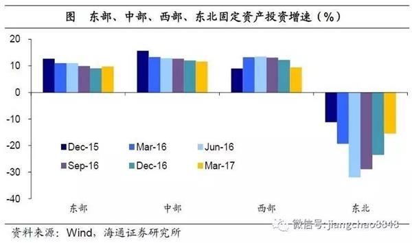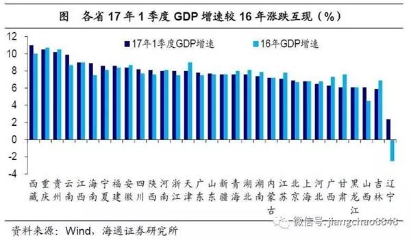 地方经济:增长模式缩影,增长动力需变!一季度各省经济表现,堪称中国经济增长模式的缩影:经济数据去水分和工业企业、国企经营状况改善令东北三省经济短暂企稳;工业品价格持续回升令河北、内蒙古、山西等资源型省份工业增速反弹;外需回暖,以及教育、科研高投入之下的产业升级,令东部沿海省份经济继续向好;中部六省继续保持投资高增长,但因投资的投入产出比持续下滑,经济增速仍普遍回落。总结来看,中国经济短期企稳,本质上仍是依靠货币和地产驱动,持续性较为有限。而金融过度繁荣已经产生了巨大的风险,未来金融去杠杆将是必由之路。而对冲风险的真正手段在于全力改革转型,包括加快国企混改和大力发展服务业,中国经济才能走上真正可持续发展之路。