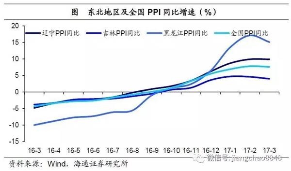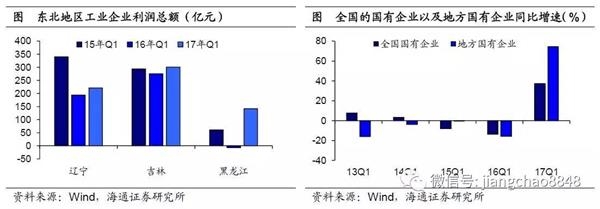 国有企业在工业品价格上涨的趋势中也获利明显。16年1季度全国国有企业利润总额同比下降13.8%,而17年1季度同比增速跃至37.3%,经营状况大幅改善。地方国有企业更是涨幅明显,17年1季度利润总额同比增速高达74.3%。而东北地区国企资产占比超过50%,远高于全国其他地区,因此经济呈现改善态势。
